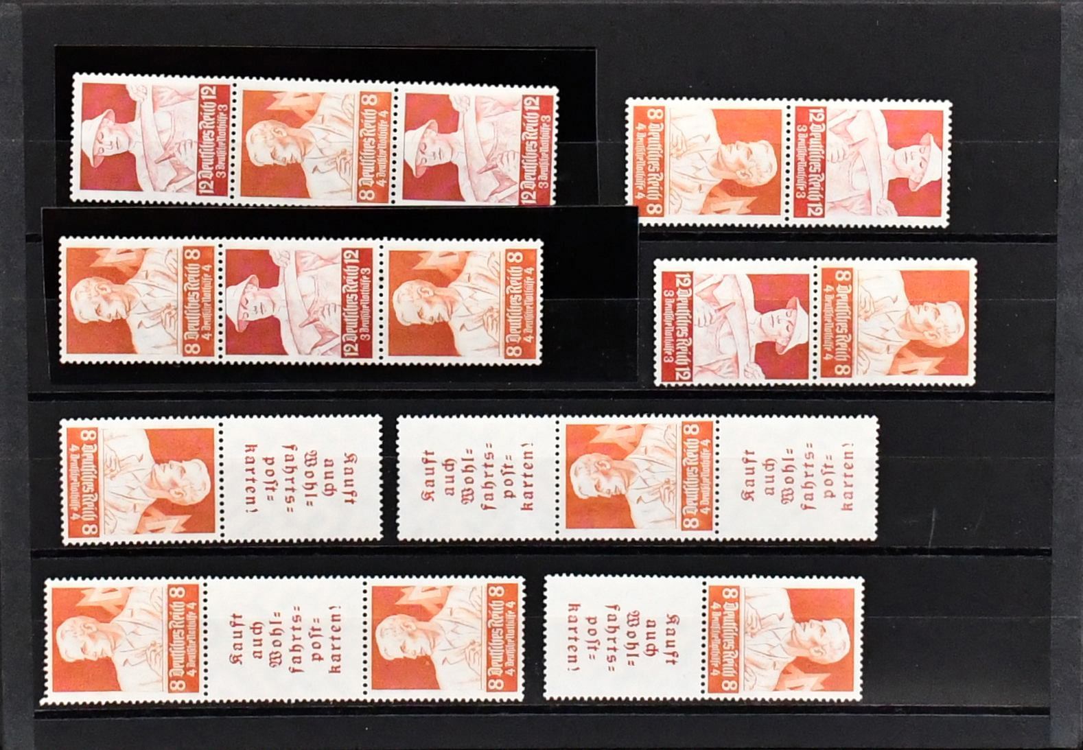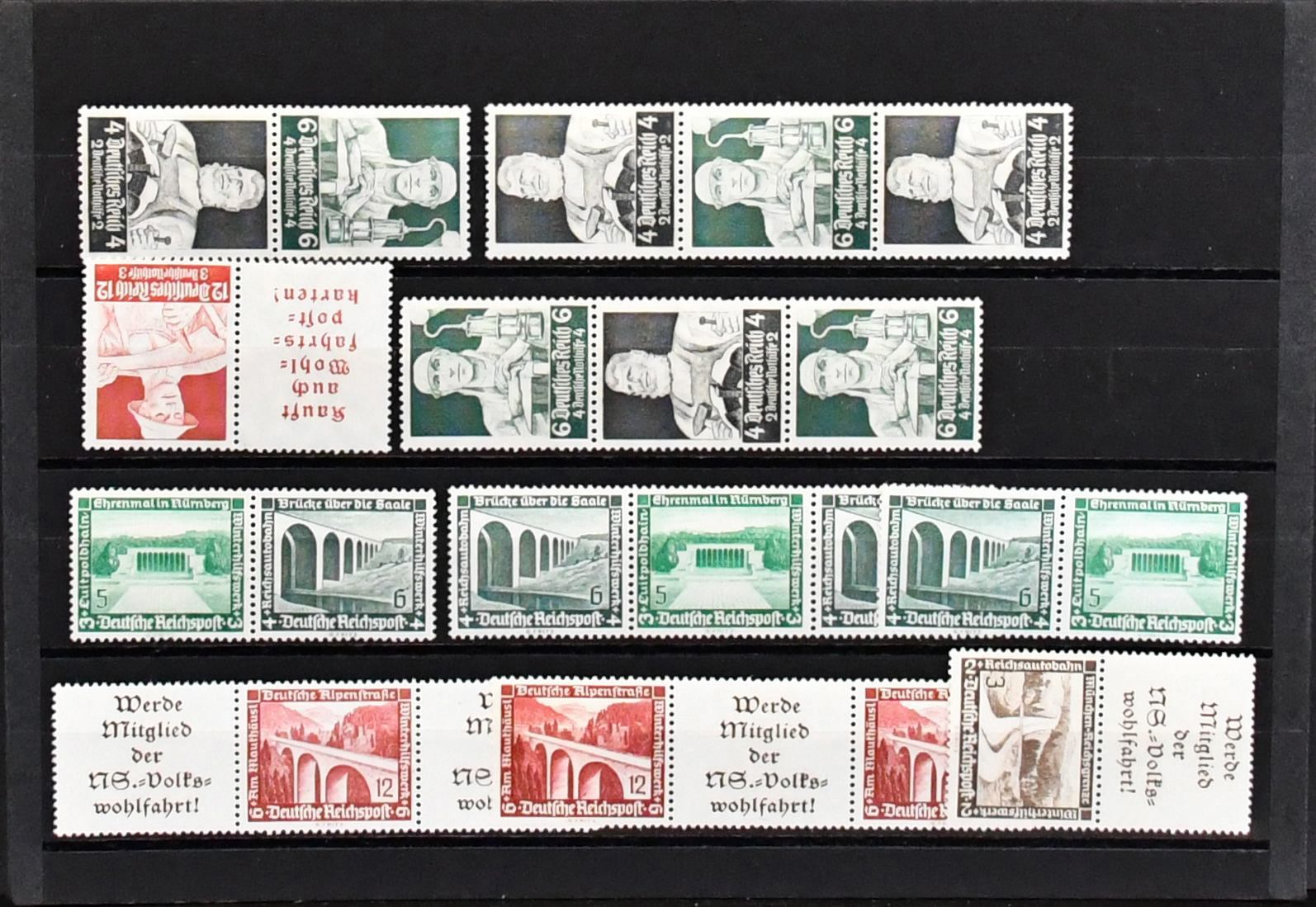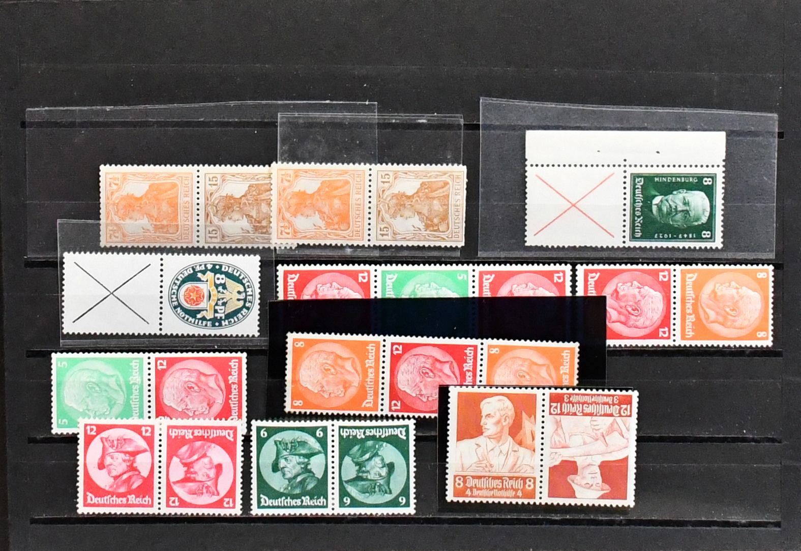 Deutsches Reich, Zusammendrucke, postfr./ungebr. Partie mit besseren Kombinationen, z.B. mit Germania S7 per zwei, Weimar S37 postfr., S72 postfr., Hindenburg mit Waffeln, K17/18, Stände weitgehend kpl., u.a. S223/26, 227/30, WHW 1936 mit 15 Zus.-Dr. kpl., dito 1937 kpl. Mi. 1300,-