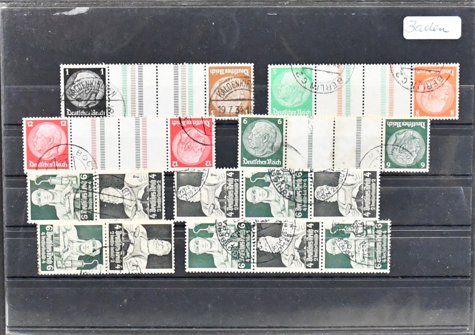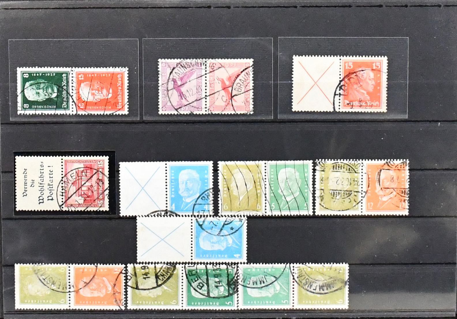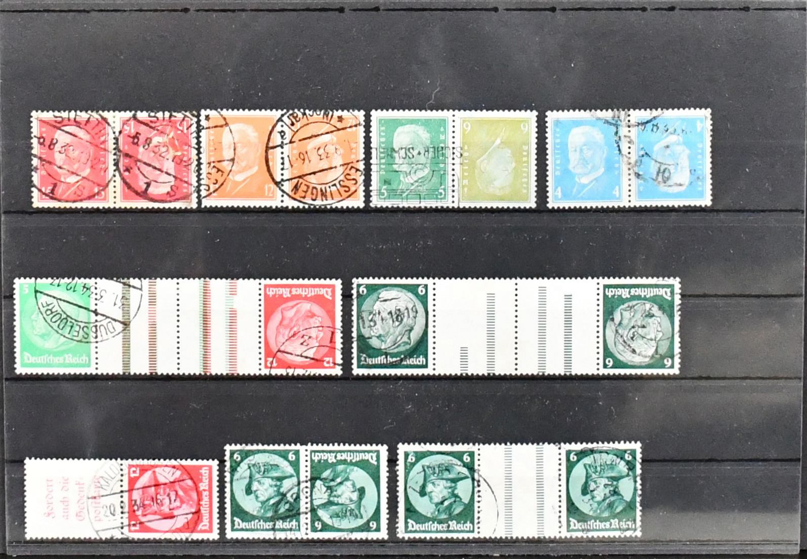 Weimar und III. Reich, Zusammendrucke, gestempelte Partie nur besserer Zus.-Druck-Kombinationen, dabei S36, W22 (Vollstempel "Braunschweig"), Kant W23 (Mi. 300,-), Nothilfe S84, Präsidenten 1932, u.a. mit Kehrdrucken, III. Reich mit "Waffeln" KZ17/18 (Mi. 160,-), K20/23, S219/22. Mi. 1300,-