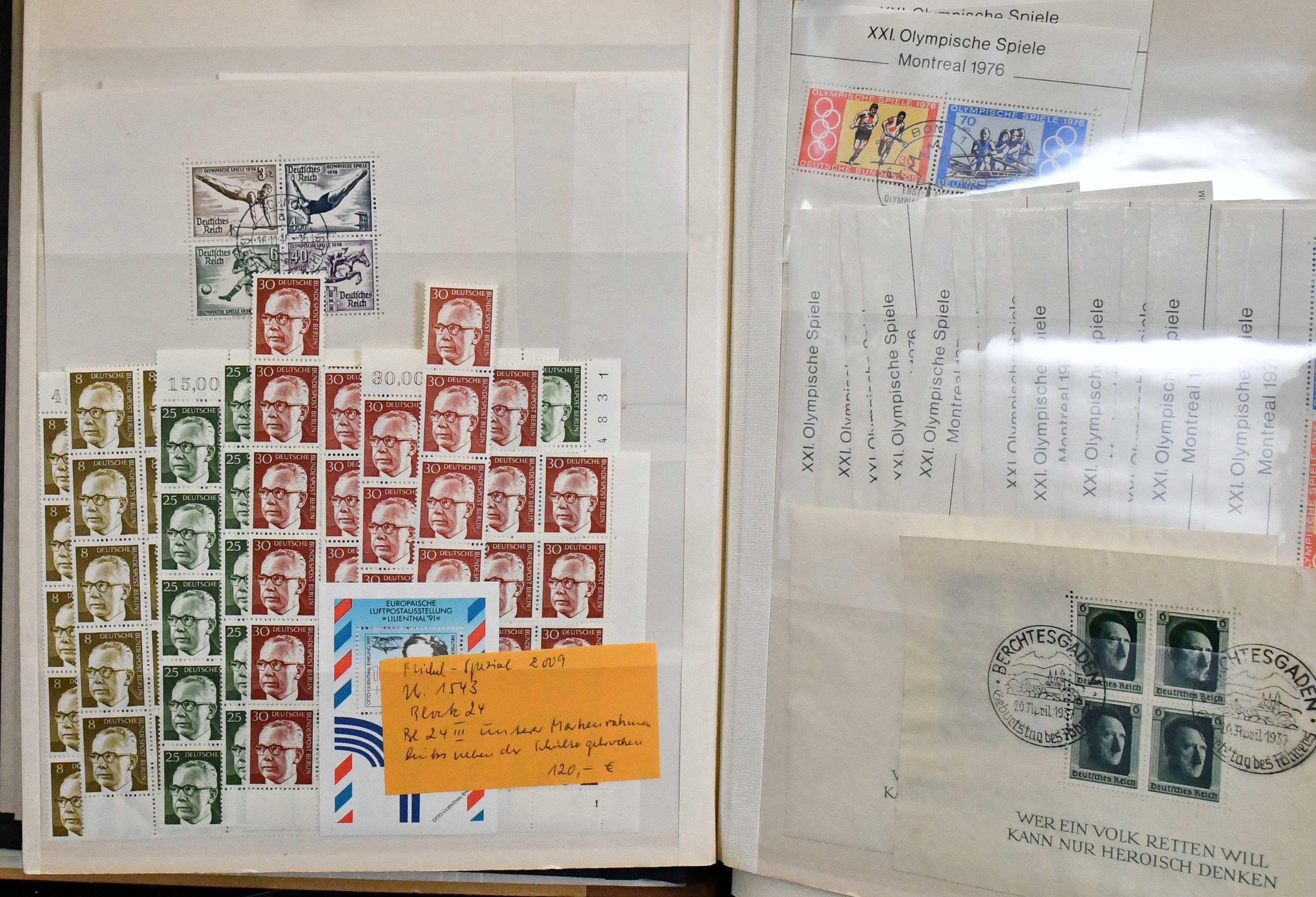 Deutschland, Bestand mit sechs Bänden sowie großer Schachtel mit Bogen, untersch. Erhaltung, dabei Sammlung Berlin aus 1948-90, mit Nr. 1/20, ab 1950 fast kpl., Bund-Lager ab 1949 mit ca. 900 Werten inkl. einigen Anfängen, dazu reichlich Markenheftchen, DDR chancenreich mit Schachtel voller MHB ab Olympia `64 (alleine 600,- Mi.), Lagerbücher ab 1949 mit vielfach postfr. Material (ca. 3000 Werte) u.v.m. Sehr zurückhaltend kalkuliert