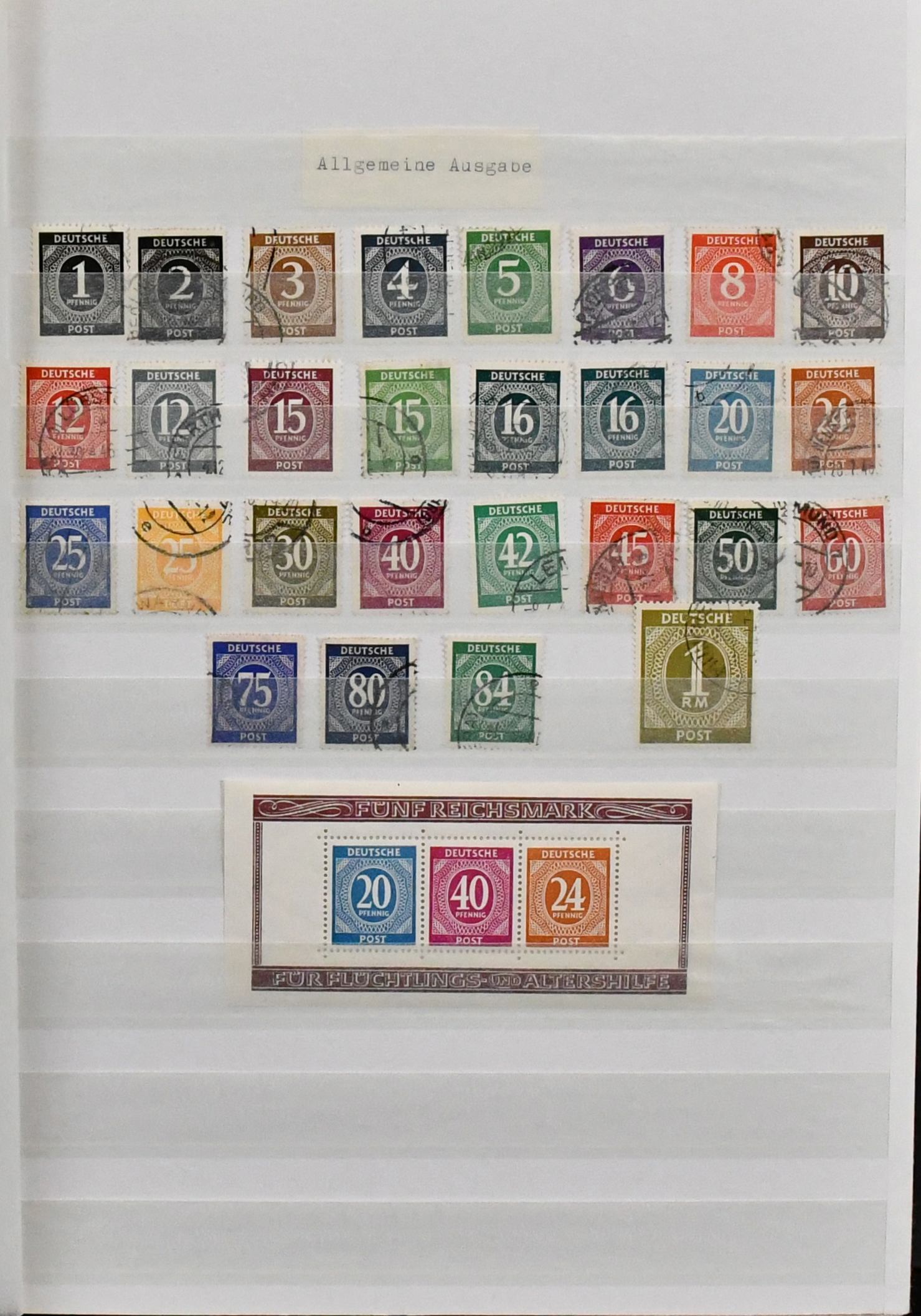 Deutschland, 1945-1949, Vordruckbinder mit ungebr./postfr. Sammlungsteilen, dabei Neusaar mit Volkshilfen 1951-53, OPD mit beiden Heuss-Sätzen, SBZ mit Nr. 20/22, Standardwerte, Bl. 3A/B, allgem. Ausgabe mit u.a. Bl. 6, Frz. Zone nahezu kpl. mit Sonder- u. Freimarken (ohne Rotkreuz-Blöcke), Kontrollrat Bl. 12A/B, Bizone mit u.a. Bl. 1 etc.