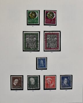 Deutschland, Sammlerbestand in acht Alben, postfr. bzw. gest., mit interessantem thematischem Ansatz, dabei z.B. christliche Motive inkl. Bund Marienkirche, Kulturerbe mit u.a. Berlin Nr. 106/109, Bund 111/12, 139/40 nochmals extra, Post-Motive mit Nr. 113/15, 141/42, Persönlichkeiten mit u.a. Berlin Nr. 35/41, 61/63, Technik, Sport, Musik, z.B. Berlin Nr. 72/74, Bund Bachsiegel etc.