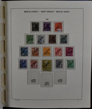 Berlin, 1948/1990, gestempelte, saubere, lediglich ohne Block 1, komplette Sammlung im Leuchtturm-Vordruckalbum. Dabei Schwarzaufdruck-Satz (Stempel bei den Mark-Werten zweifelhaft und daher unberechnet), sauberer Rotaufdruck-Satz, Nr. 35/41, 61/63, 68/70, alle Glocken usw. Mi. 5200,- + unberechnete Werte