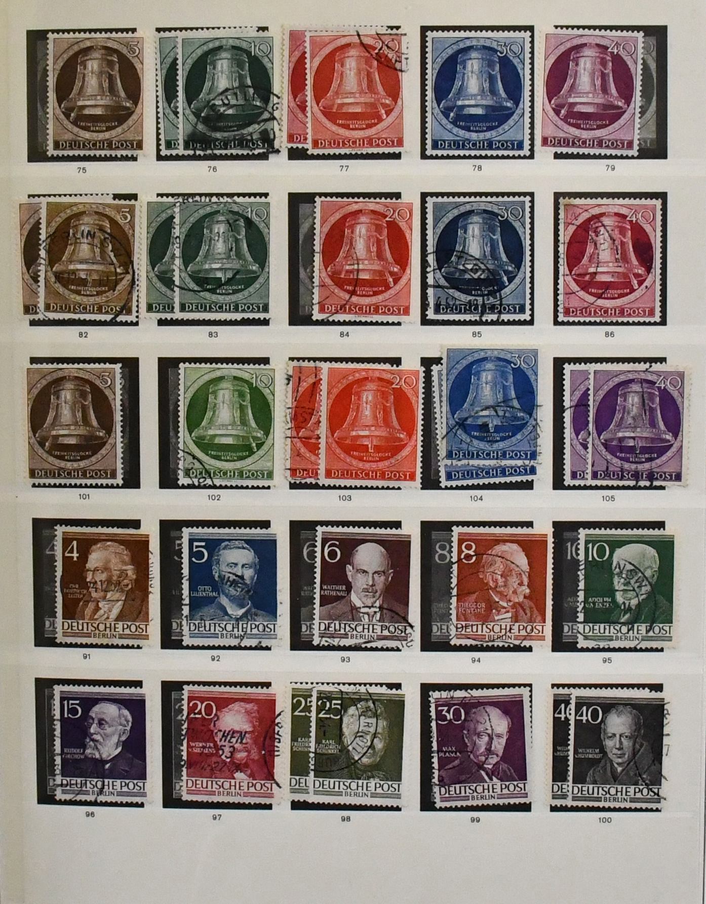 Berlin, 1948/1990, gest. Slg. ab Nr. 1/15, mit Nr. 21/32, 40, 61/63, sowie den Jahrgängen 1950/1990 kpl., inkl. allen Glocken, Nr. 71/74, 106/9 usw., im Vordruckalbum. Mi. 3600,-