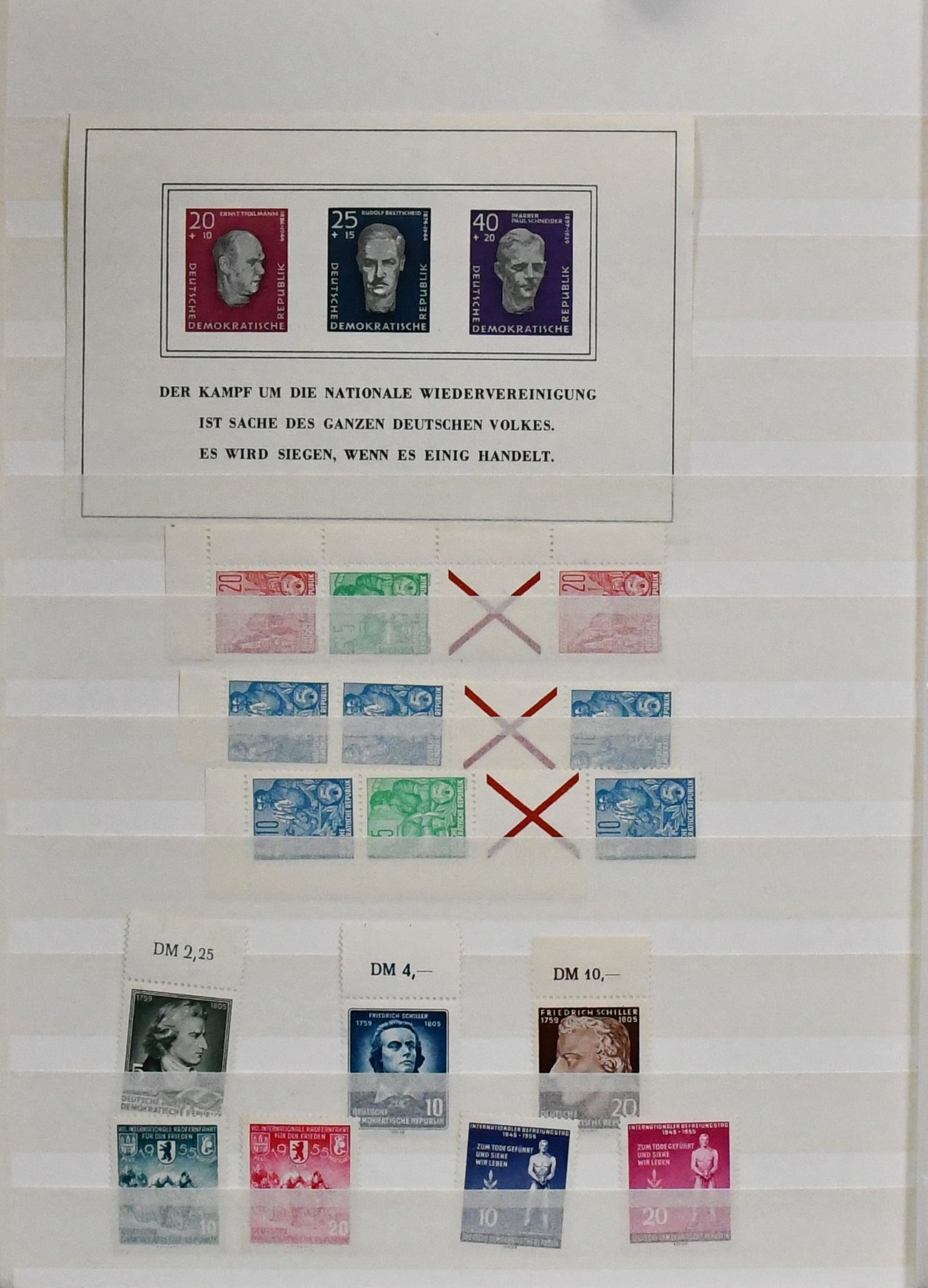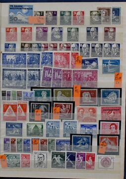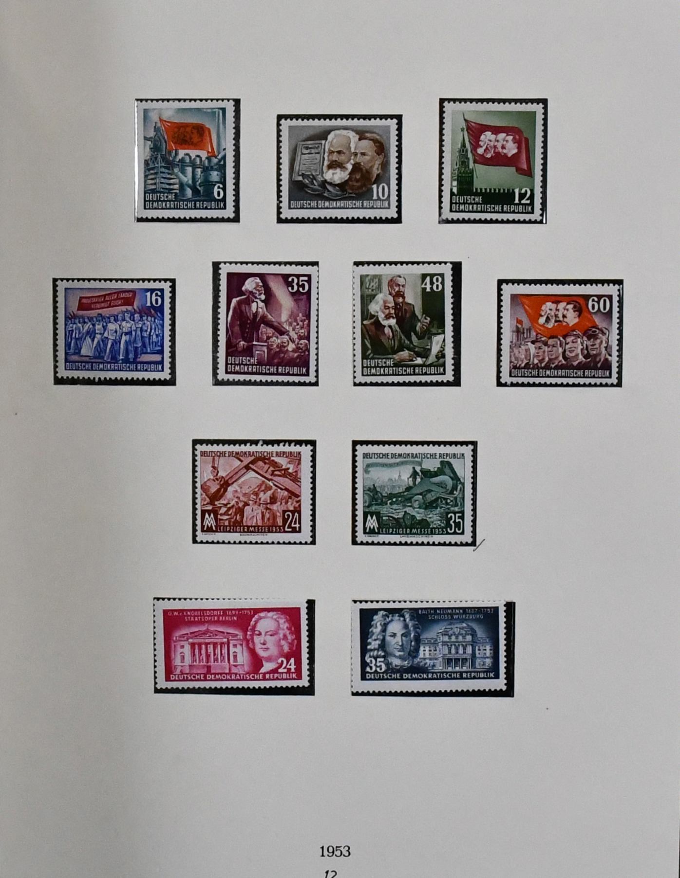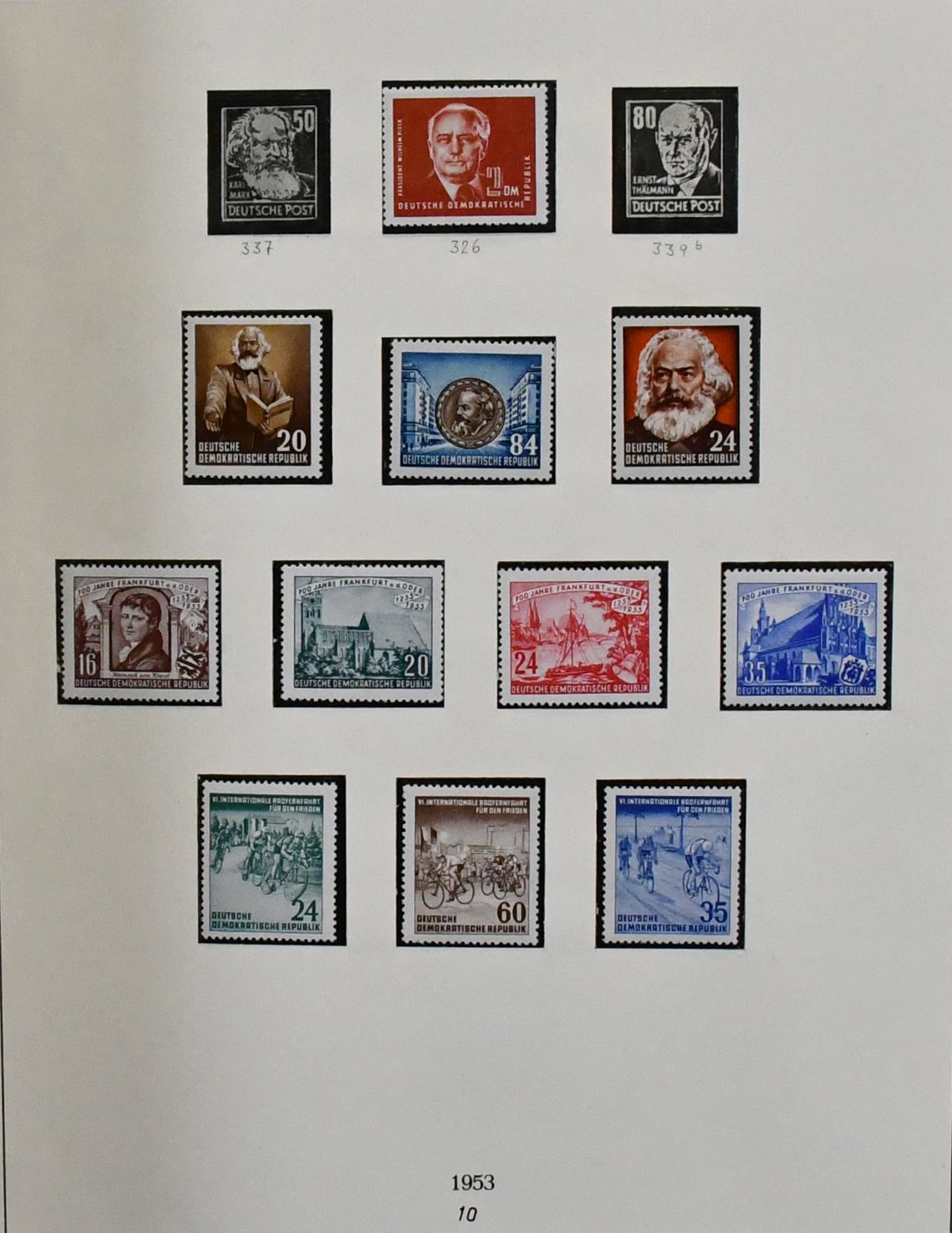 DDR, 1951/1973, postfrische Slg. mit Nr. 288, 322/26, Bl. 8/9B, Bl. 10/19 usw., von 1954-1973 kpl., in zwei Lindner-Vordruckalben. Mi. 2800,-