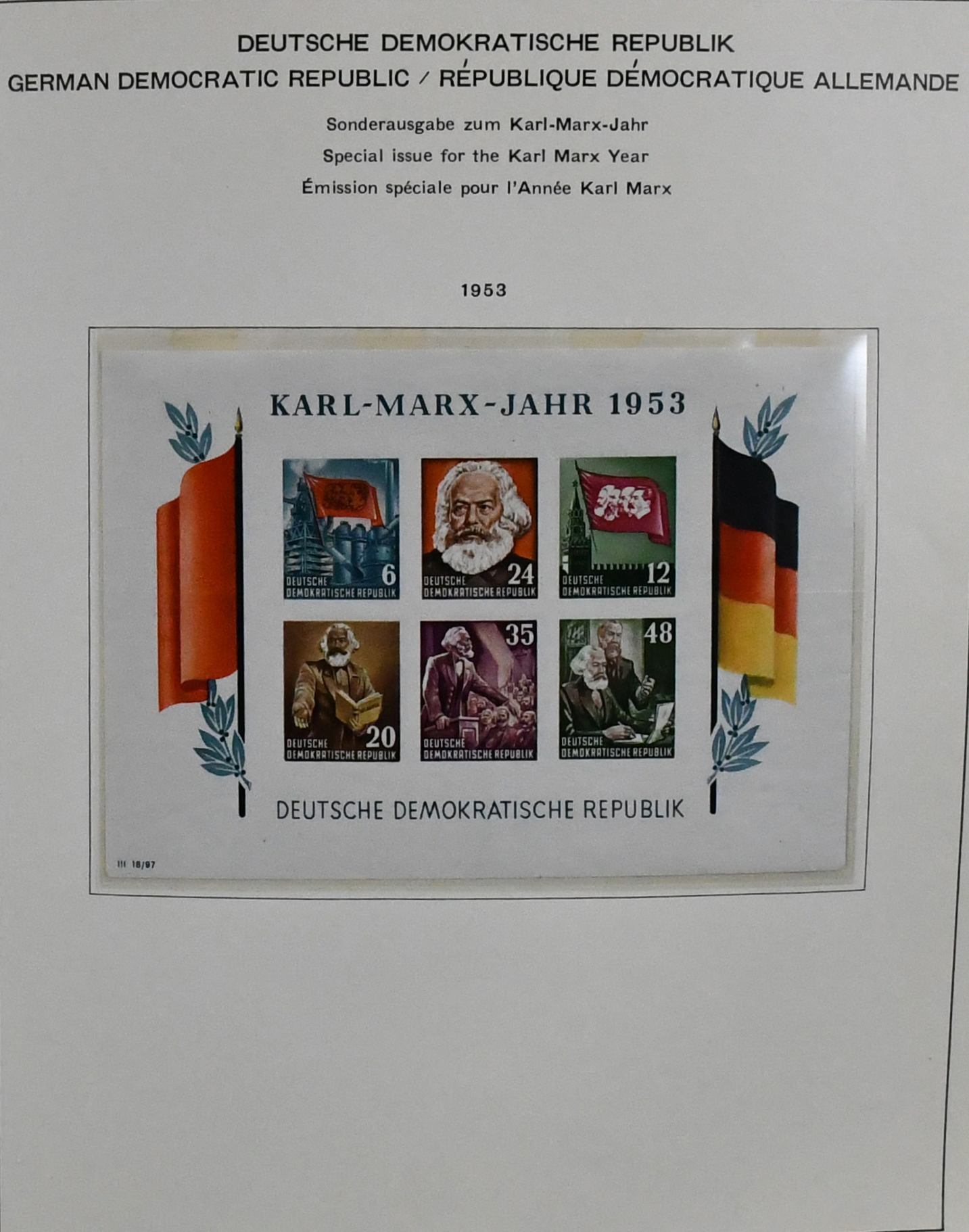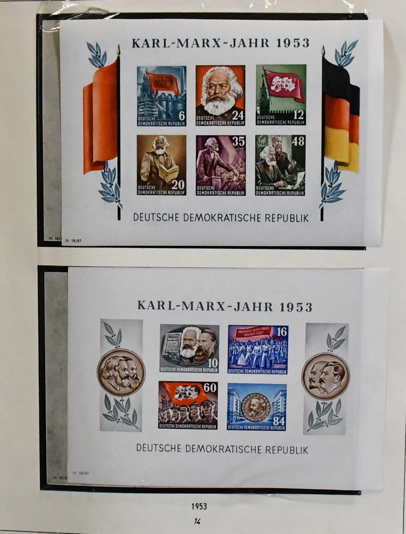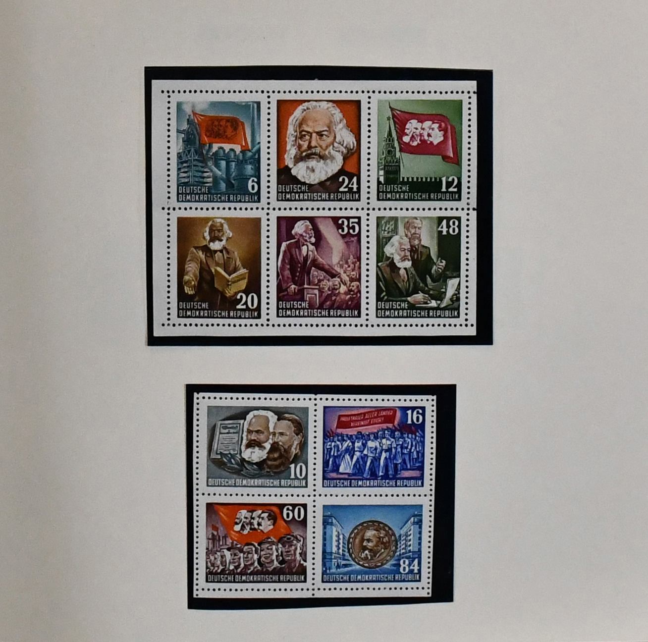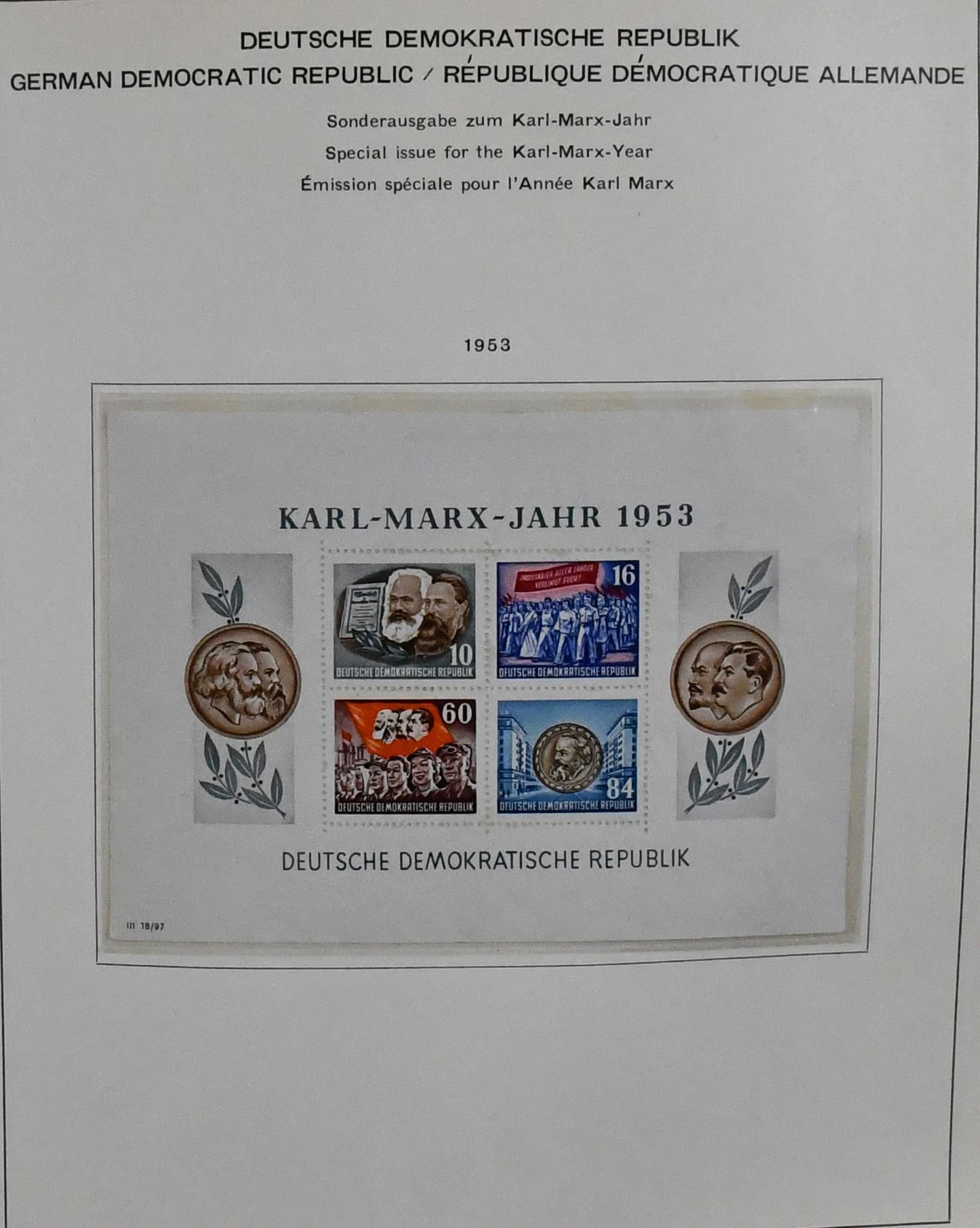 DDR, 1949/1981, gest. Slg. ab Nr. 242/70, u.a. von 1955-1981 (ohne Bl. 15, aber mit postfr. Bl. 13) kpl. Dazu zwei ungebr. Marx-Blöcke, alles in drei Vordruckalben. Mi. 2800,-
