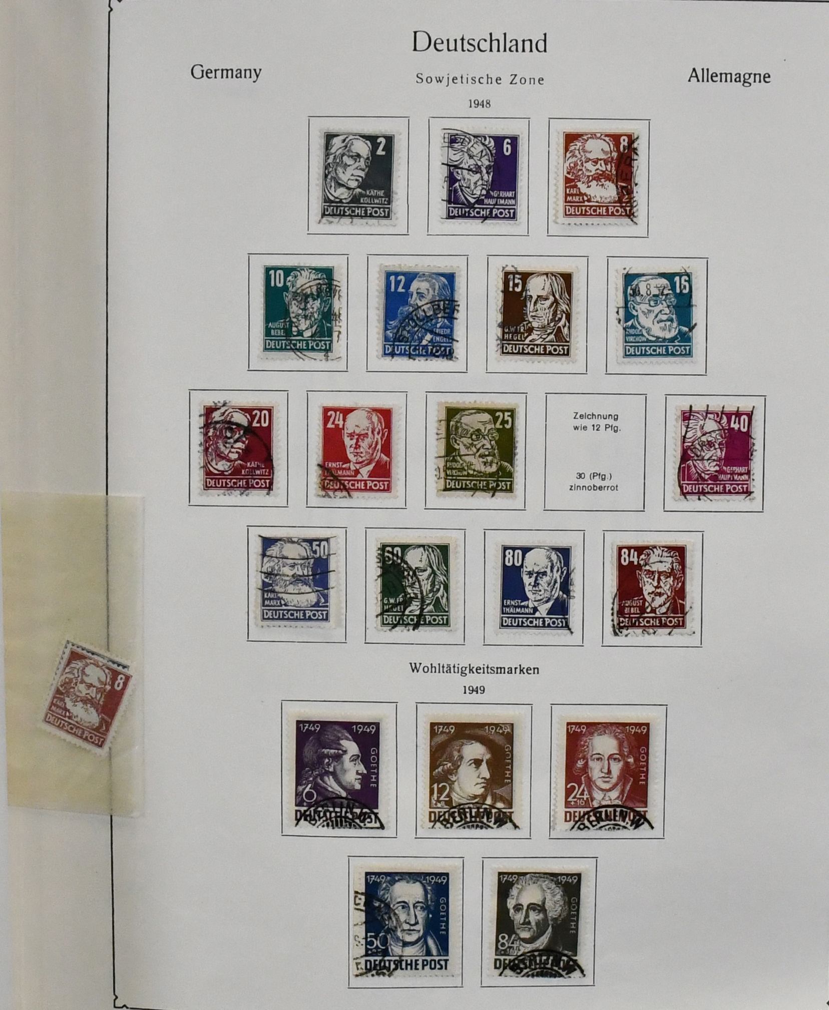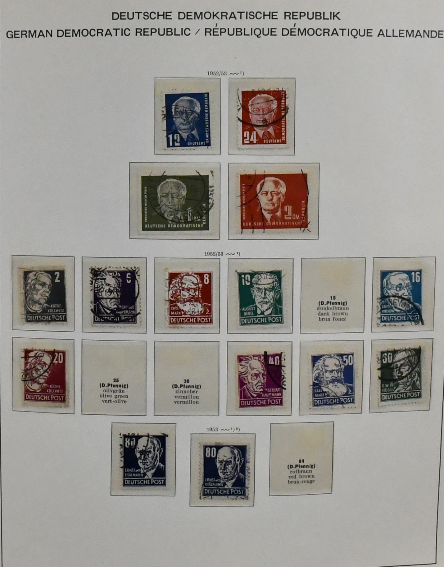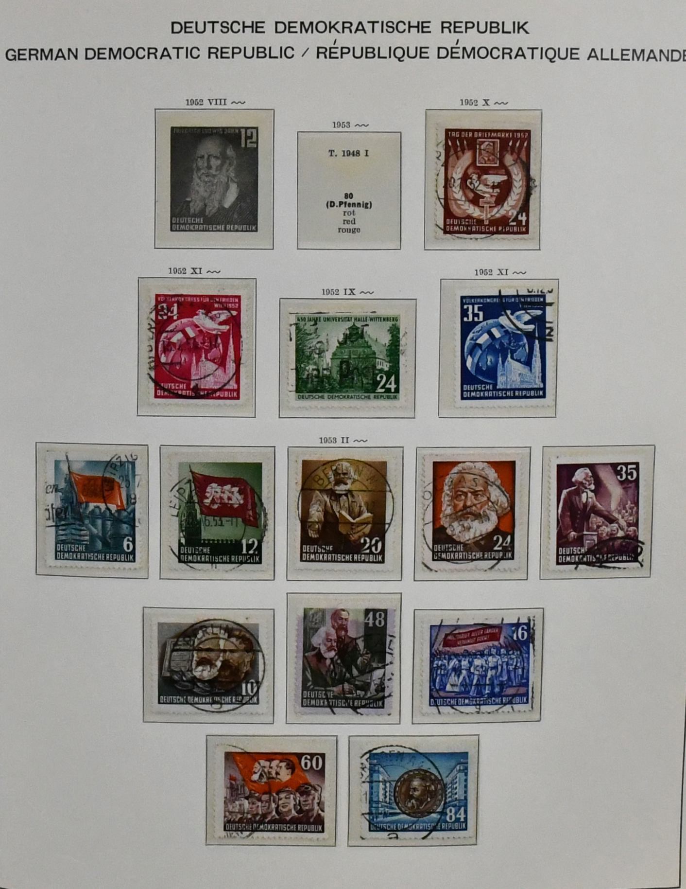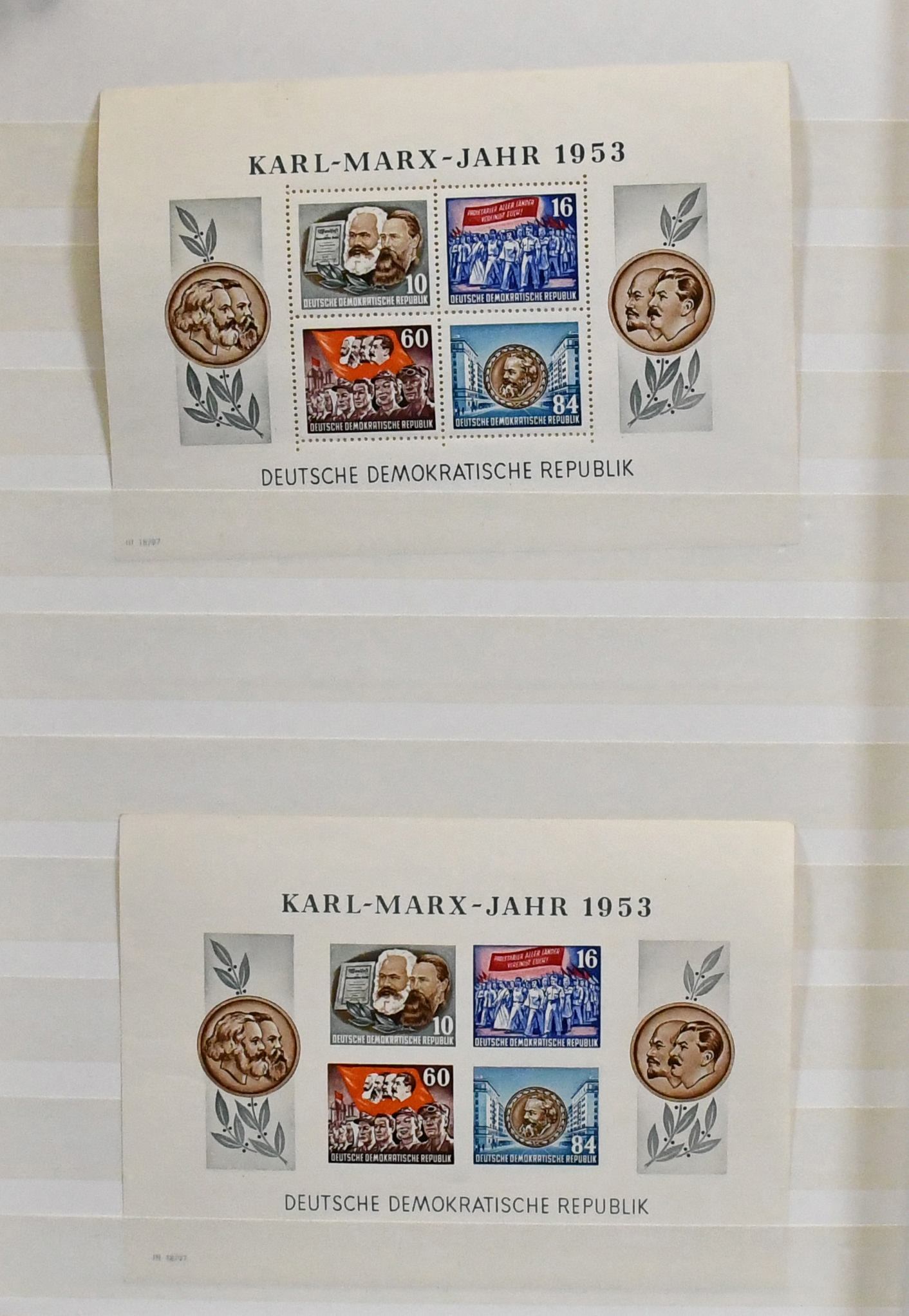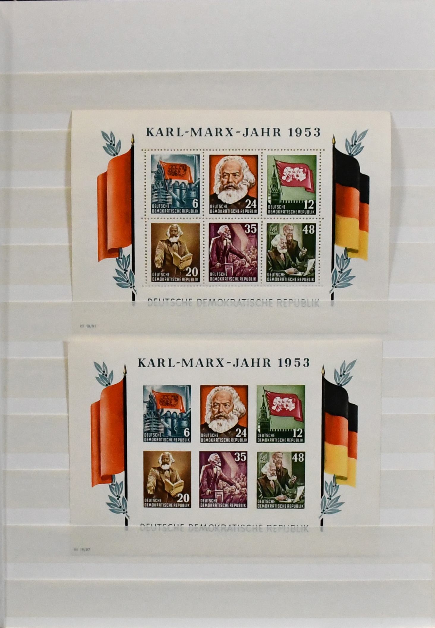 DDR, 1949/1981, gest. Slg. ab Nr. 242/70, u.a. von 1955-1981 (ohne Bl. 15, aber mit postfr. Bl. 13) kpl. Dazu zwei ungebr. Marx-Blöcke, alles in drei Vordruckalben. Mi. 2800,-