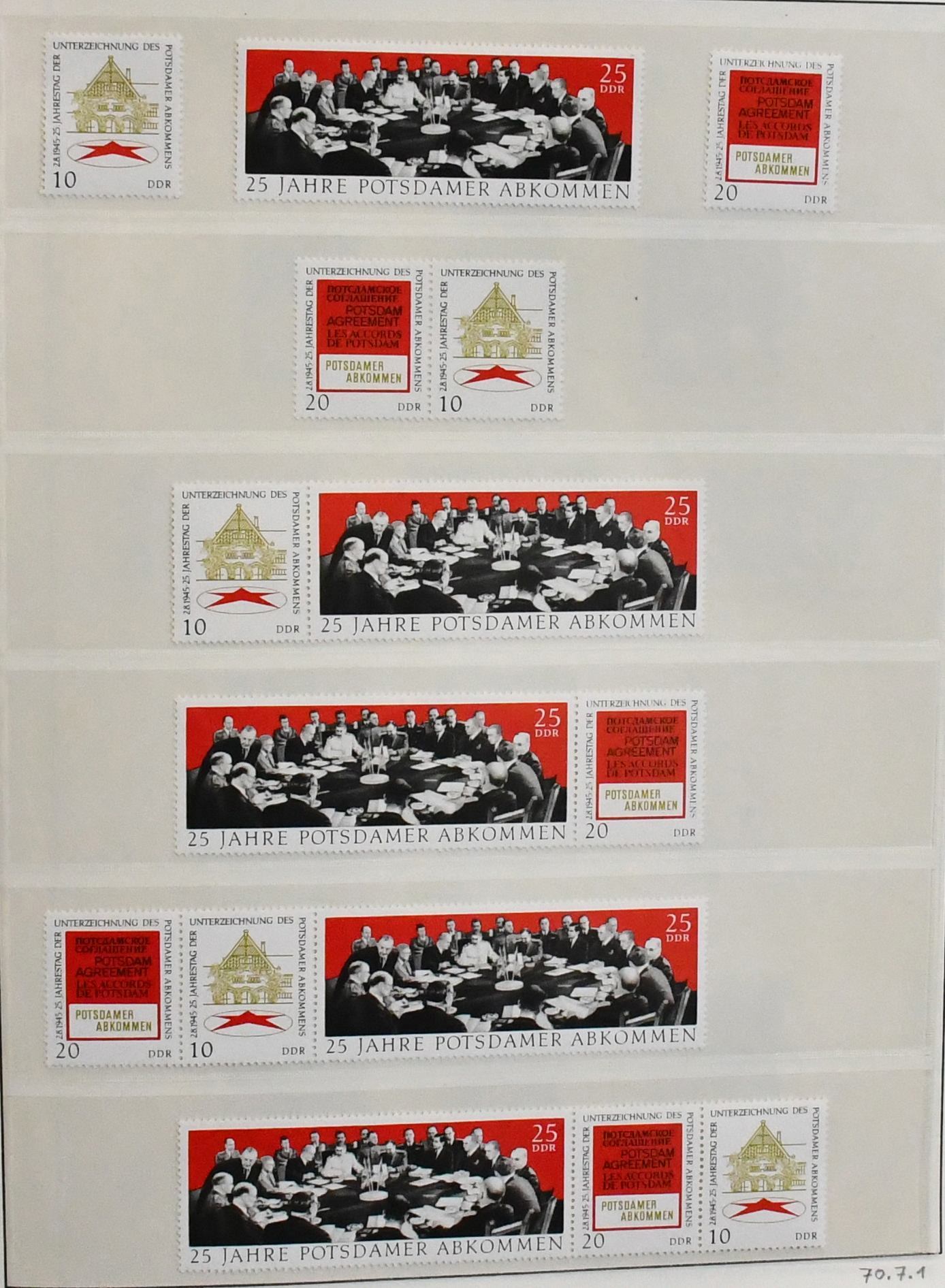 DDR, 1960/1990, postfrische, überkomplette Sammlung mit, neben den normalen Ausgaben, einer Vielzahl von Zusammendrucken, dabei u.a. alle Zus.-Dr. ex Nr. 2364/68, Zus.-Dr.-Bogen inkl. Nr. 2364/68, 2464/71, 2983/86 usw., in drei dicken Leuchtturm-Vordruckalben. Dazu Propagandafälschung Nr. 10. Mi. 3400,- plus einige ältere, sowie einige haftende Werte unberechnet dazu