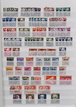 DDR, Bogenbestand in drei dicken Mappen, dabei postfrische Bögen Ulbricht und Dienst, viele gest. Bögen kleine Bauwerke usw. Zusätzlich eine postfr. Partie Rollenmarken Ulbricht in Streifeneinheiten. Viel Material