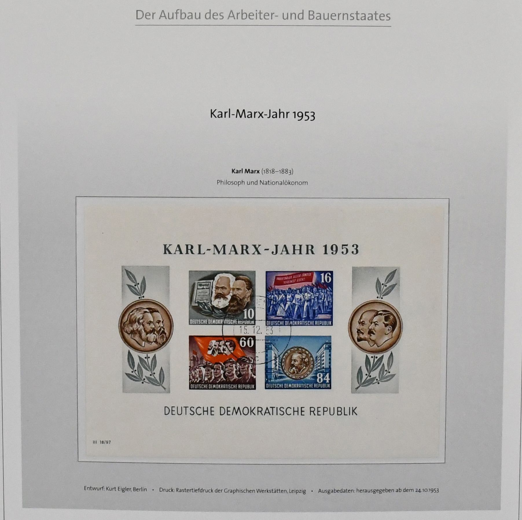 DDR, 1949/90, gestempelte (nur Bl. 8/9B und Nr. 332 ungebr.), bis auf Bl. 7, komplette Slg. mit allen besseren Ausgaben, u.a. Nr. 261/70, 286/88, Persönlichkeiten mit 80 Pfg. auf Lackpapier, alle vier Marx-Blöcke, Bl. 10/19 usw., in zwei Schaubek-Vordruckalben. Mi., alles billigst als Gefälligkeitsentwertung gerechnet, bereits 4500,-