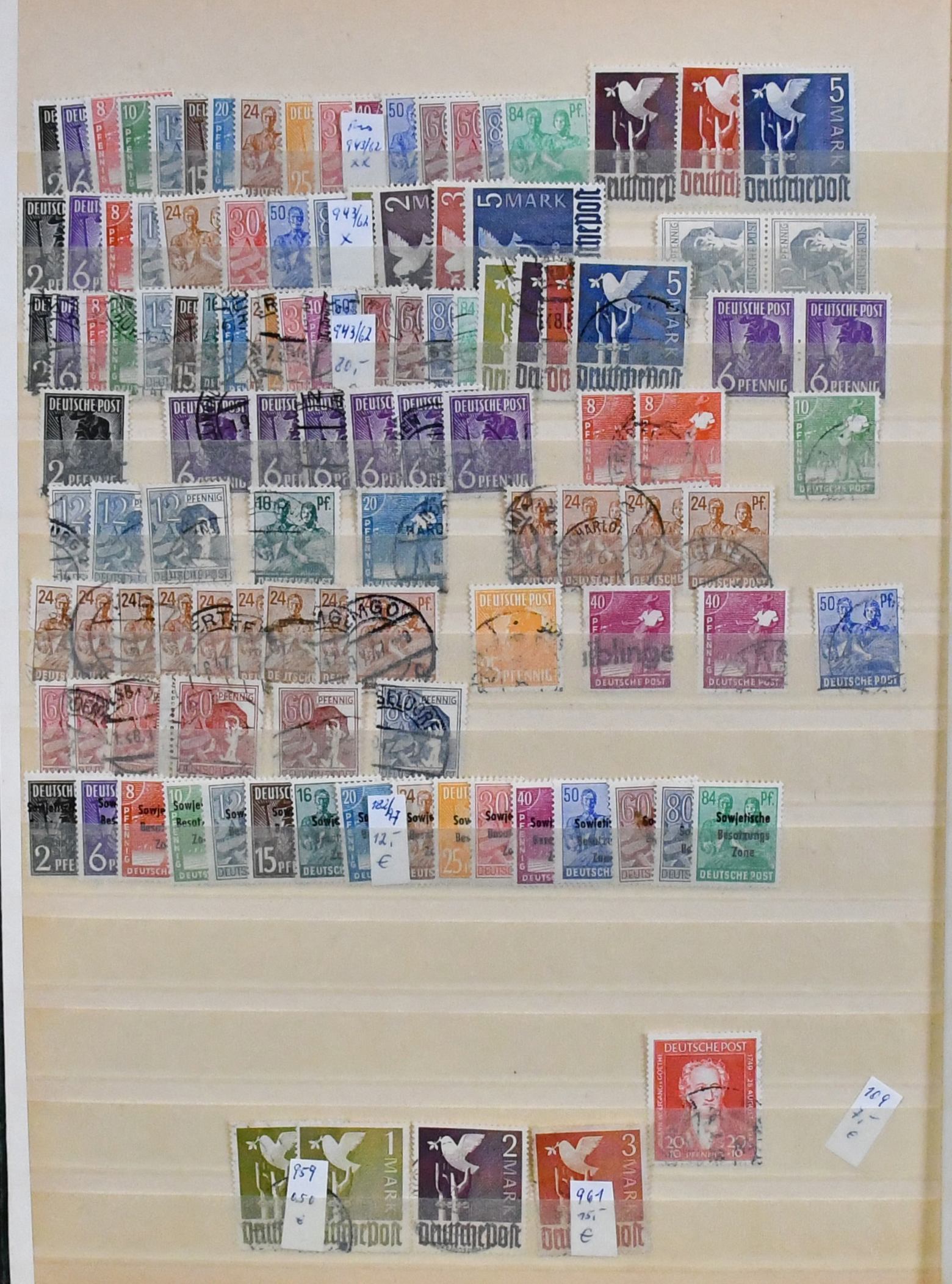 Alliierte Besetzung, 1945/49, Slg. mit Gemeinschaftsausgabe, viel Bizone ab gest. Nr. 1/33, viel Bauten gest., u.a. Nr. 73/79eg, dreimal Nr. 100I, 101/10, sowie etwas SBZ, im Lindner-Klemmbinder, günstiger Ausruf!