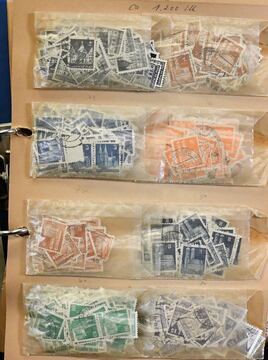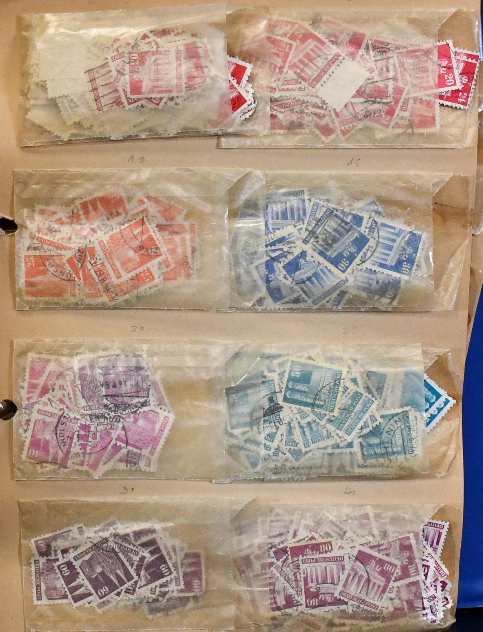 Bizone, Bauten, Partie von über 10.000 gestempelten Werten ex 2 Pfg. bis 2 Mark, weit und eng gezähnt, nach Wertstufen in Pergamintütchen sortiert. Ideal zum Plattieren und Fundgrube für Besonderheiten
