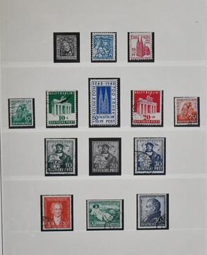 Bizone, bis auf die Ziffern-Band-/Netzaufdrucke (die enthaltenen sind falsch und unbewertet) kpl. Slg., oft postfrisch, ganz wenig, z.B. Nr. 49IIb, ungebraucht, u.a. mit Bauten eg/wg (hier wenige Marken gest.), einige Bauten-Abarten, alle Sondermarken, Bl. 1 SST. Mi. 1680,-