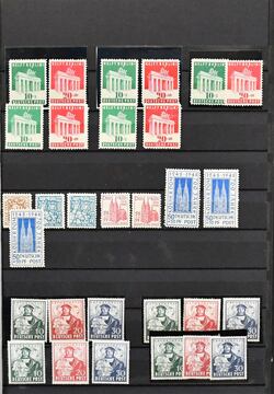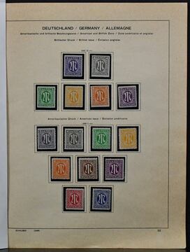 Bizone, postfr. Slg. auf Vordrucken, mit AM-Post allen drei Drucken, Aufdrucken I u. II, Band-/Netz-Ziffern ungeprüft, Bauten wg, Bl. 1 etc.