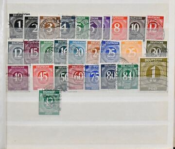 Bizone, 1945/1949, fast kpl. Slg., meist gest., mit Nr. 1/35 gest. (Nr. 34/35 ungepr.), 36/51I/II (ohne Nr. 49) kpl. gest., 24 versch. Werte ex Nr. 52/68, teils ungebr., teils gest., Nr. 73/100eg/wg und beide Typen der Mark-Werte, Bl. 1 postfr. (Mi. 140,-), 101/10 usw., auf Leuchtturm-Vordrucken. Sehr hoher KW!