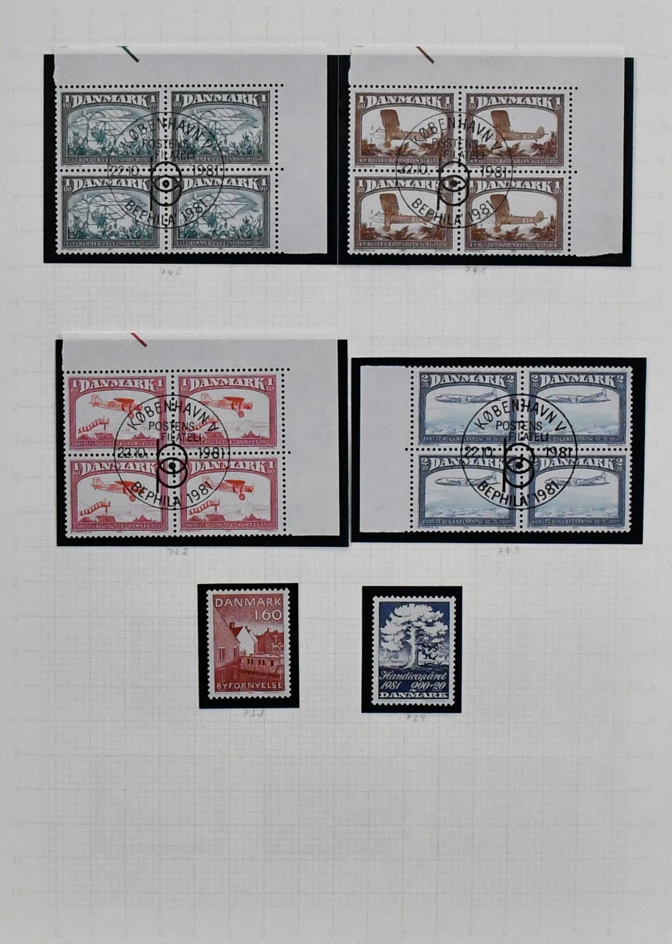 Dänemark und Gebiete, interessanter Sammlungsbestand in sieben Alben, dabei Dänemark 1851-1980, ab Nr. 1, 7/8 mit Typen, Krönchen 1884 mit Nr. 11-15, Ziffern ab 1870 ebenfalls spezieller, Nr. 66 u. 81, 131/42 in Viererblöcken, ferner Lagerbestände ab Klassik, u.a. Nr. 1IIa (Attest Wahl), Flugpost 1929, Sammlungen Grönland mit Maximumkarten/Belegen bis 2008, Färöer 1975-2001 doppelt gesammelt im Lindner-T-Album etc.