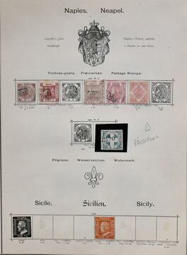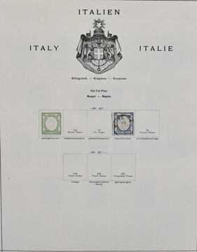 Italien, 1852-1896, meist gestempelte Sammlung in oft guter Erhaltung auf alten Albumblättern. Dabei u.a. altitalienische Staaten mit Kirchenstaat, Parma, Neapel usw. Hier viele Fälschungen, aber auch gutes echtes Material wie z.B. Modena Nr. 1I-2I, 3II, 5I u. 6I (sauber ungebr.), ferner Italien mit u.a. Nr. 3, 5, 13 (ungebr.), 14, 22, 29-36, 41 ungest., 49 (ungebr.), 50-54, 58, 59 etc., auch Paketmarken Nr. 1-6, Dienst Nr. 7-8, Verrechnungsmarken mit Nr. 1-3 gest., Ital. Post im Ausland, Allgem. Ausgabe mit Nr. 9, 17 usw. Schönes Objekt mit hohem KW!